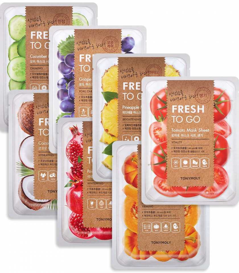 - Fresh To Go Mask Sheet от Tony Moly. Маска представлена в нескольких вариациях: с экстрактами алоэ, огурца, ананаса, томата, винограда.