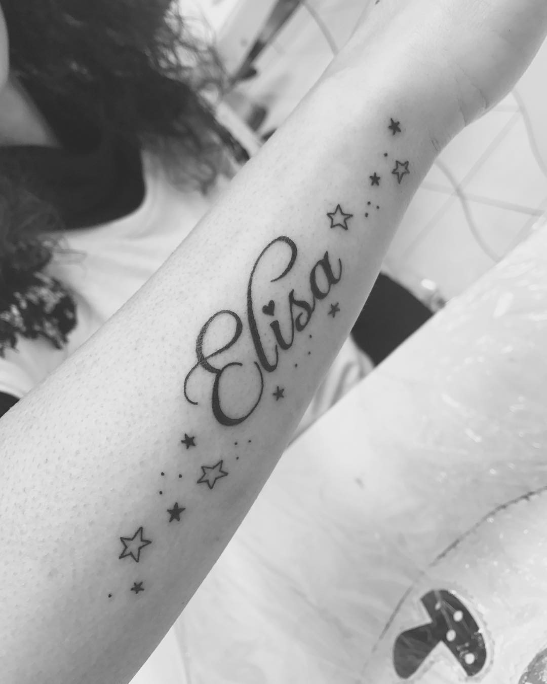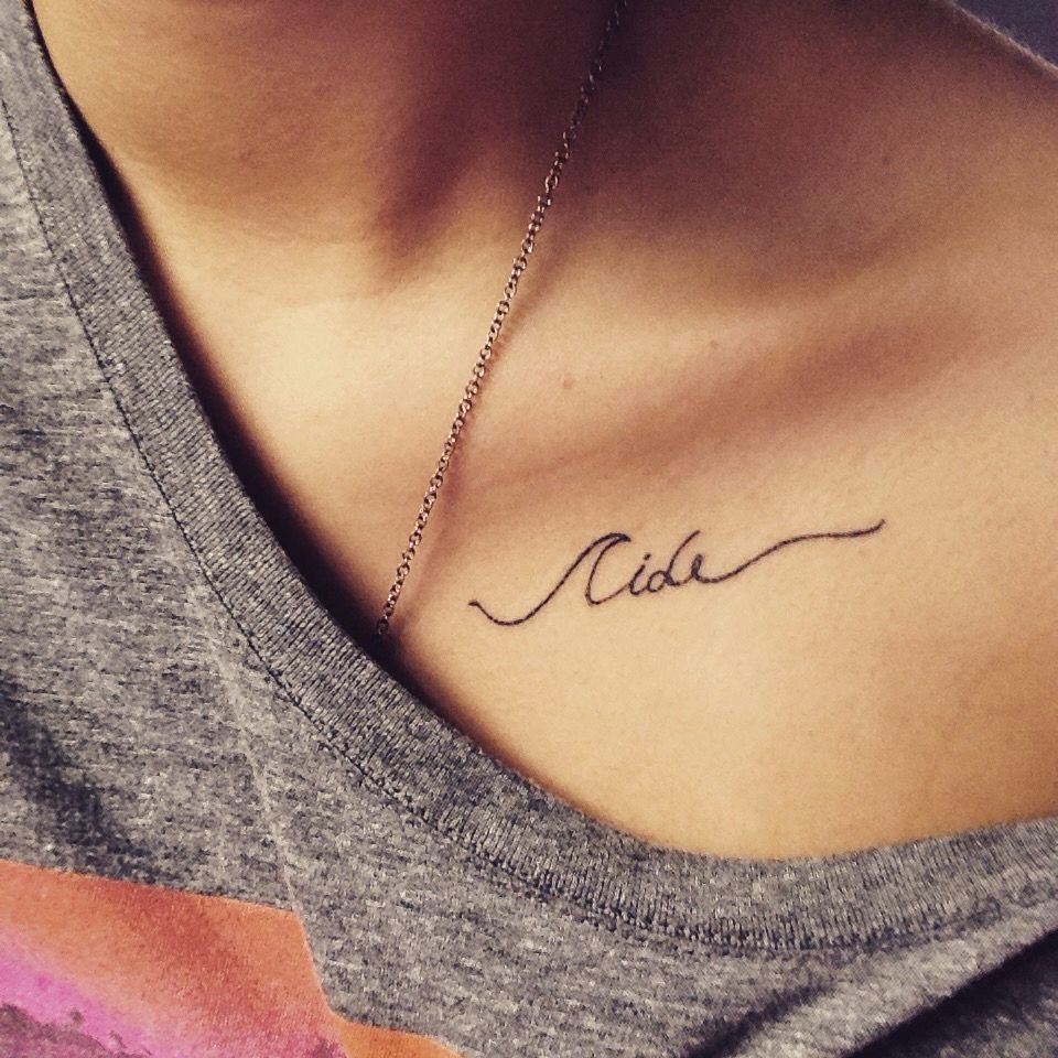 Последний тренд в подобных миниатюрных рисунках — единственное слово или даже буква. Значение этих маленьких тату сугубо индивидуально: его вкладывает автор. Это может быть имя любимого человека или ребенка, жизненное кредо, важная дата.