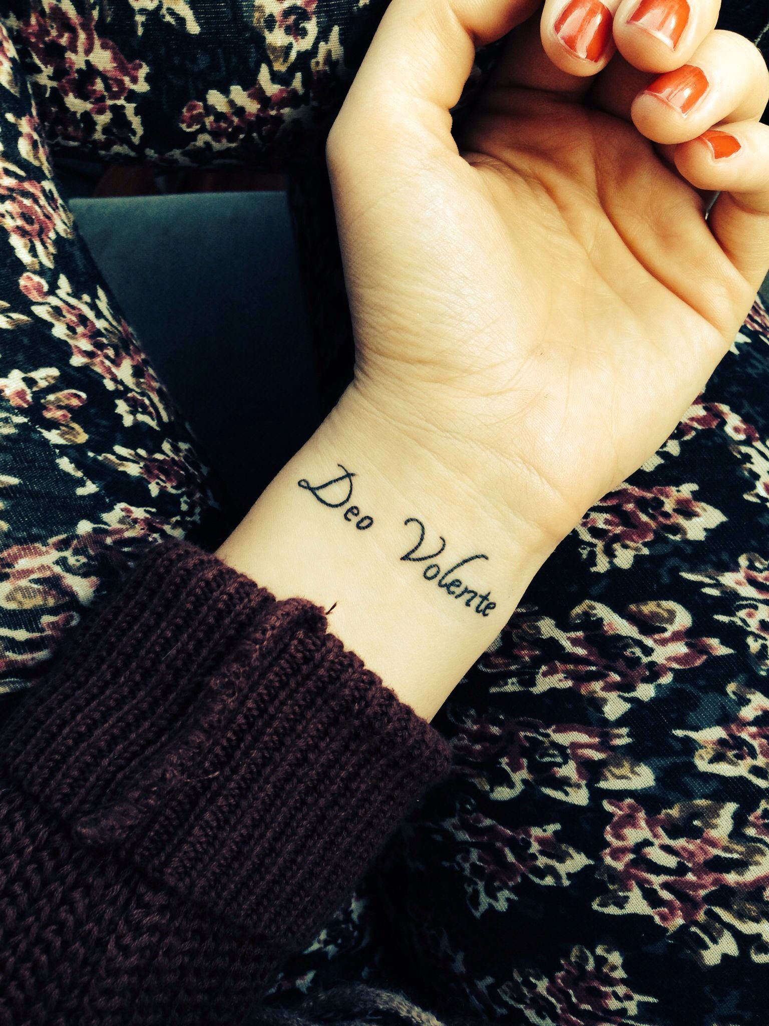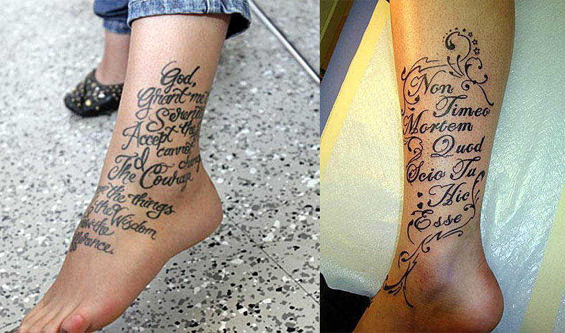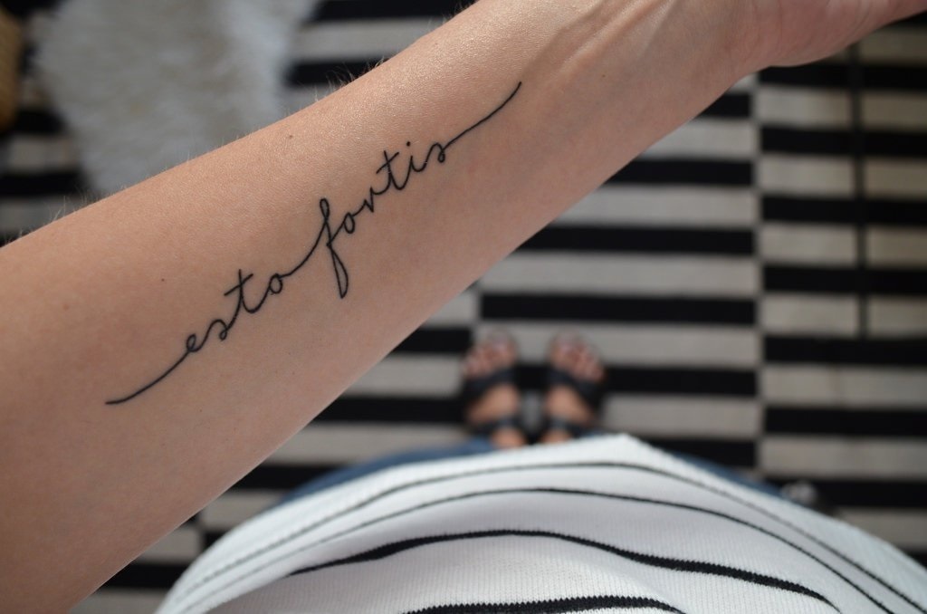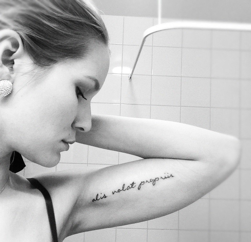 Текстовые тату, к которым относятся афоризмы. Их часто выполняют на языке оригинала, поэтому следует быть особенно внимательной к точности воспроизведения букв, чтобы не ходить всю жизнь с искаженными фразами на руке