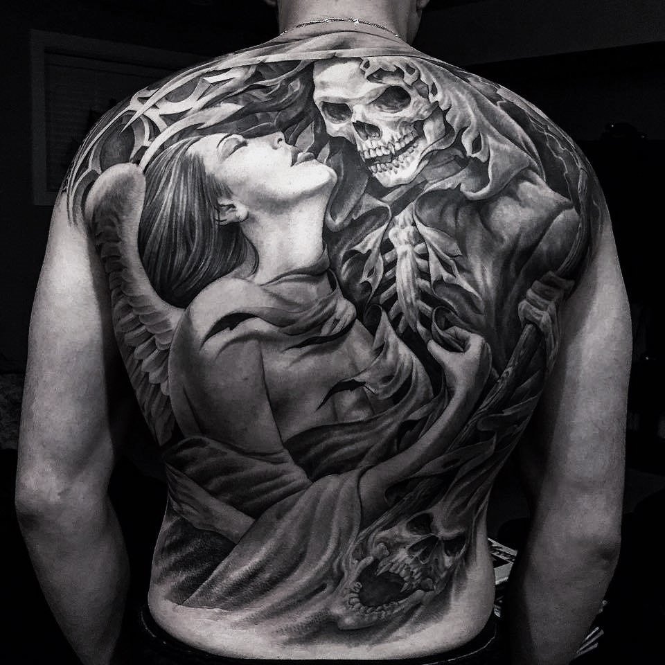 Возможности практически безграничны из-за большой площади кожи. Можно нанести как обширные рисунки, так и более мелкие. Главное, чтобы они были со смыслом. Девушкам нужно быть аккуратными при выборе тату в этой области. После родов растяжки могут привести к полной деформации рисунка.