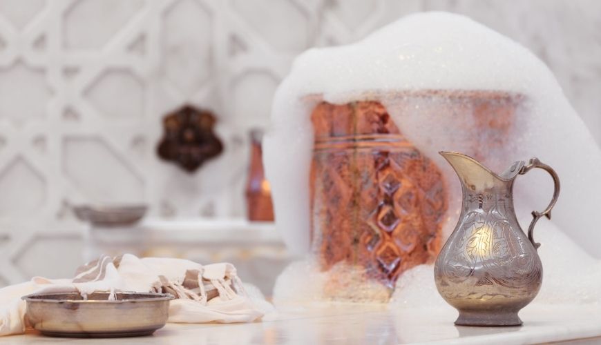 Обувь является обязательным атрибутом в хамаме, так как полы очень сильно нагреваются и ходить по ним босиком невозможно. Традиционные тапочки имеют деревянную подошву, что делает нахождение на полу комфортным.
