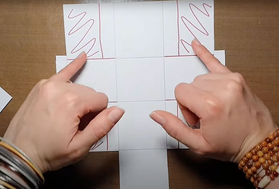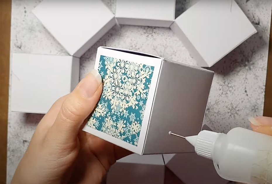 Коробка-кубик состоит из одной заготовки, так что не придется отдельно собирать крышку. Кроме того, в таком варианте достаточно просто подогнать размеры — чтобы все кубики получились одинаковыми, можно просто распечатать одну заготовку на нескольких листах бумаги, найти ее можно в интернете.