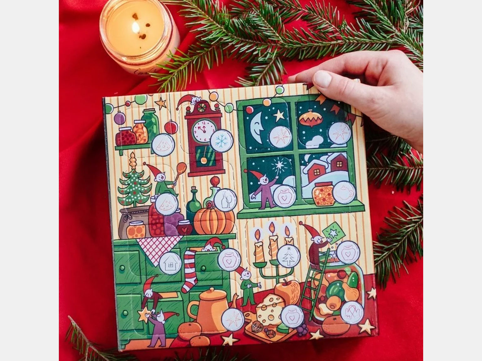 Интересный кулинарный адвент: в нём, конечно, не продукты для ежедневной готовки (вряд ли кто-то оценил бы кусок сырой курицы в таком виде), а гурманские сюрпризы — от мармелада из айвы до смеси специй и орехов для готовки. Стоит он 4500 рублей.