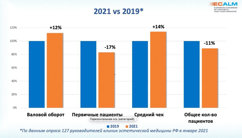 По данным СРО «Национальная ассоциация клиник эстетической медицины» (НАКЭМ), в 2021 году рынок эстетической медицины в РФ показал существенный рост по отношению к 2020 году, но относительно небольшой по сравнению с 2019 годом.