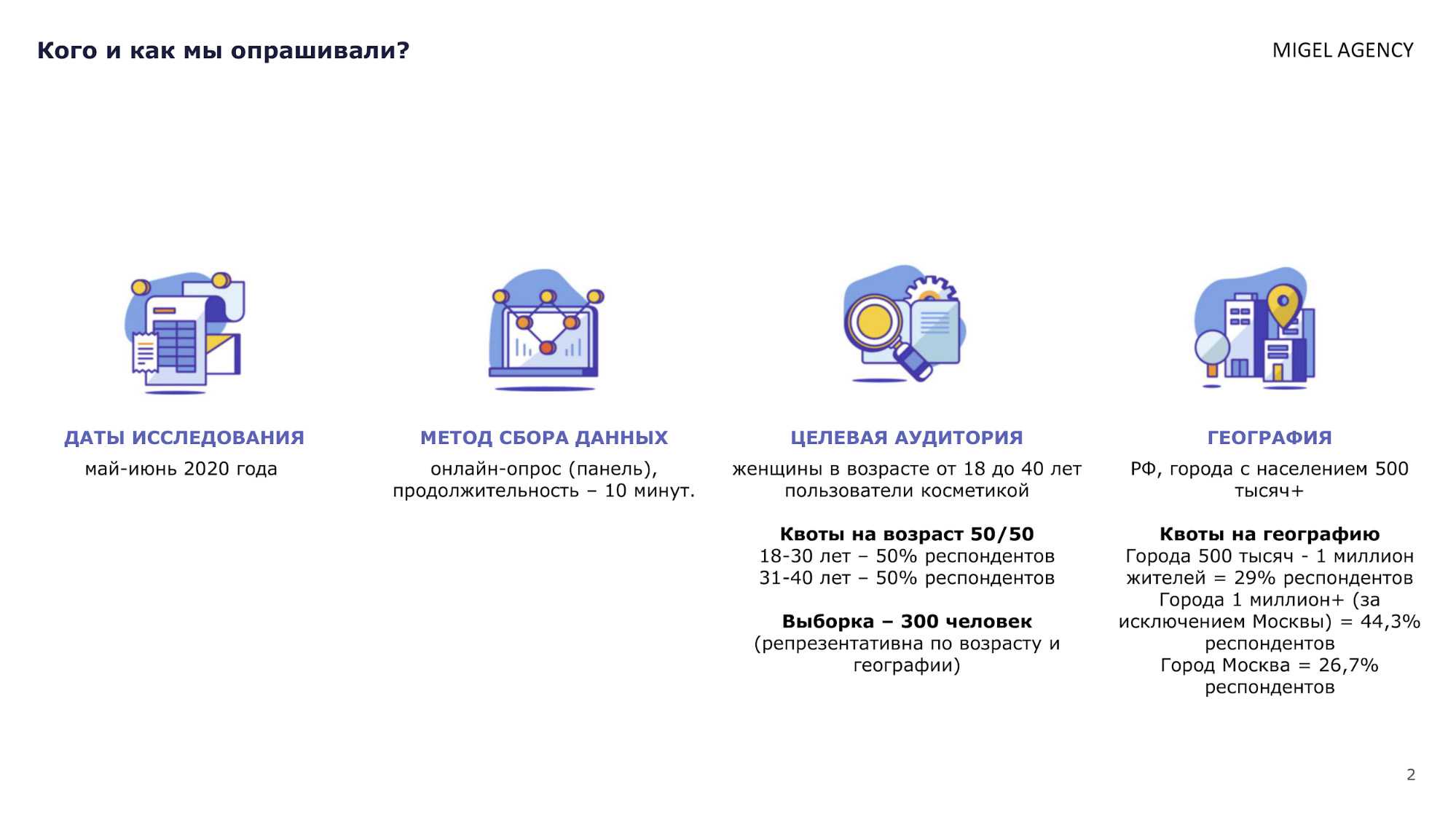 Квоты на возраст ставили 50/50 (50% женщин в возрасте от 18 до 30 лет и 50% от 31 до 40 лет), чтобы можно было анализировать отдельно и молодую, и взрослую аудиторию. Это распределение соответствует реальному распределению возраста среди женщин.