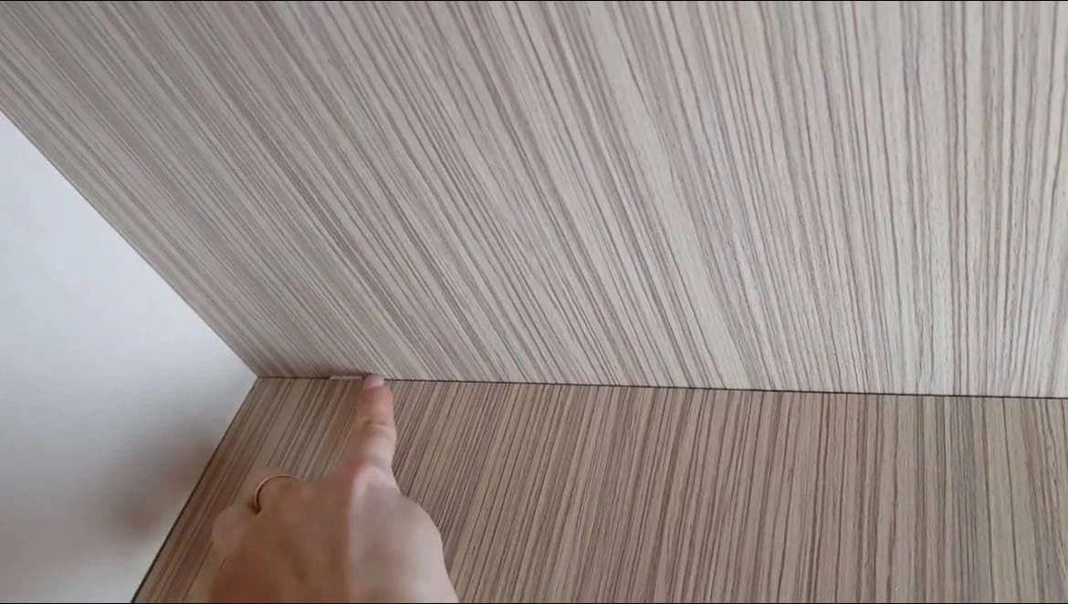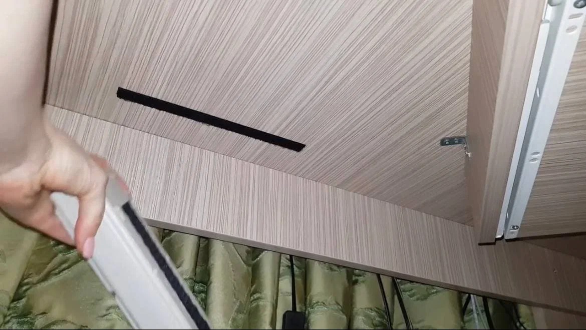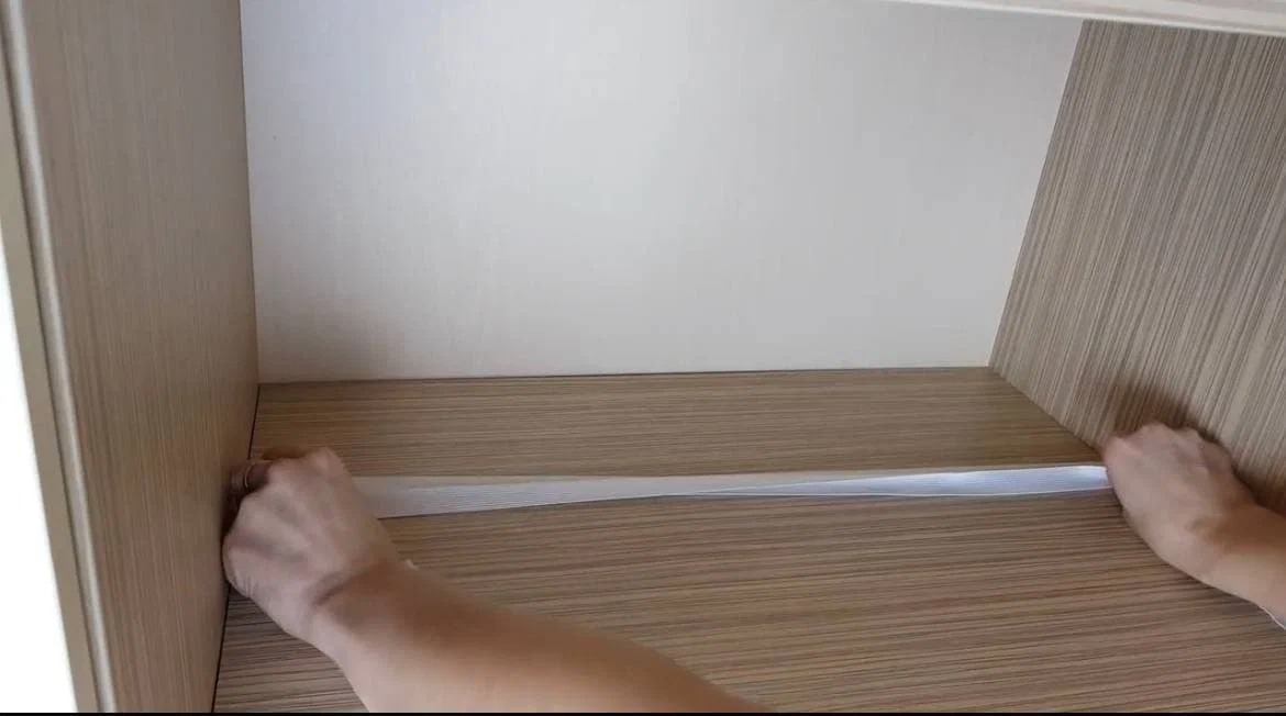 Это делается достаточно просто. Если полка плотно прилегает к стенке шкафа, то концы резинки просто плотно прижимаются к стенкам. Если же полка неплотно примыкает к стенкам шкафа, то советую её полностью обвязать резинкой.