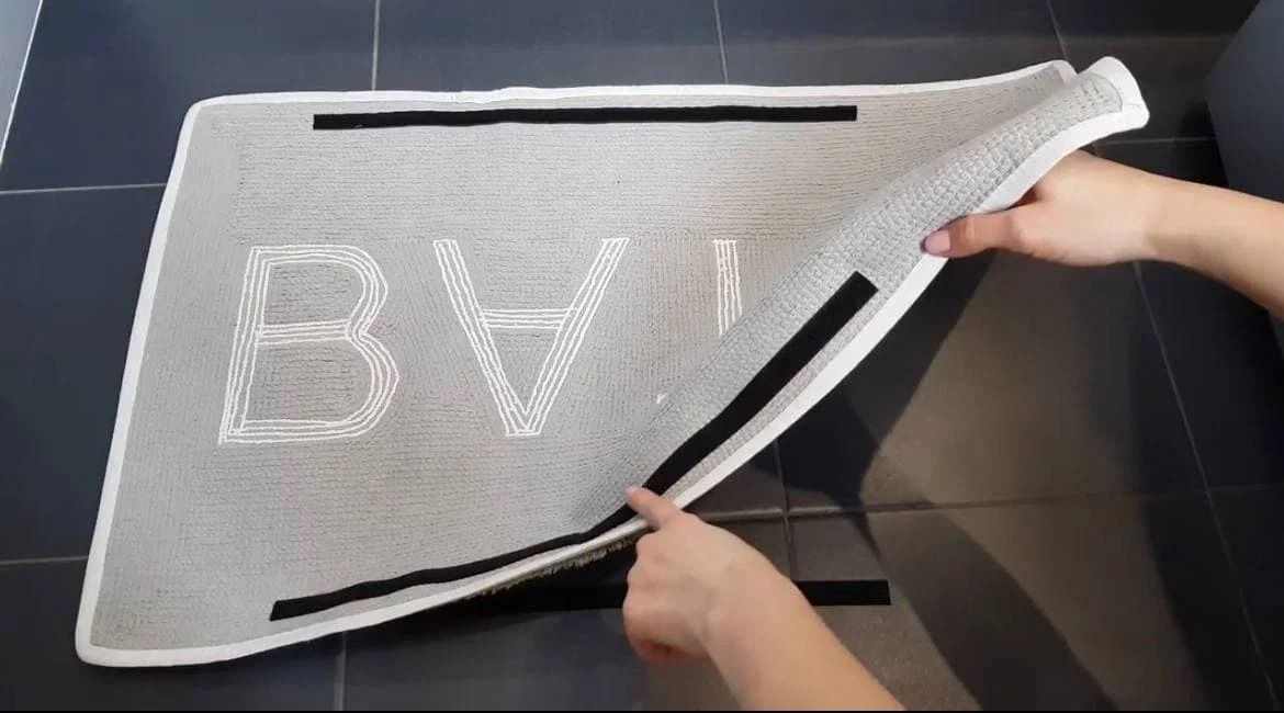Лучше эту ленту пришить к коврику, чтобы во время стирки она не оторвалась и чтобы она оставалась на коврике, когда вы его снимаете, а не на полу
