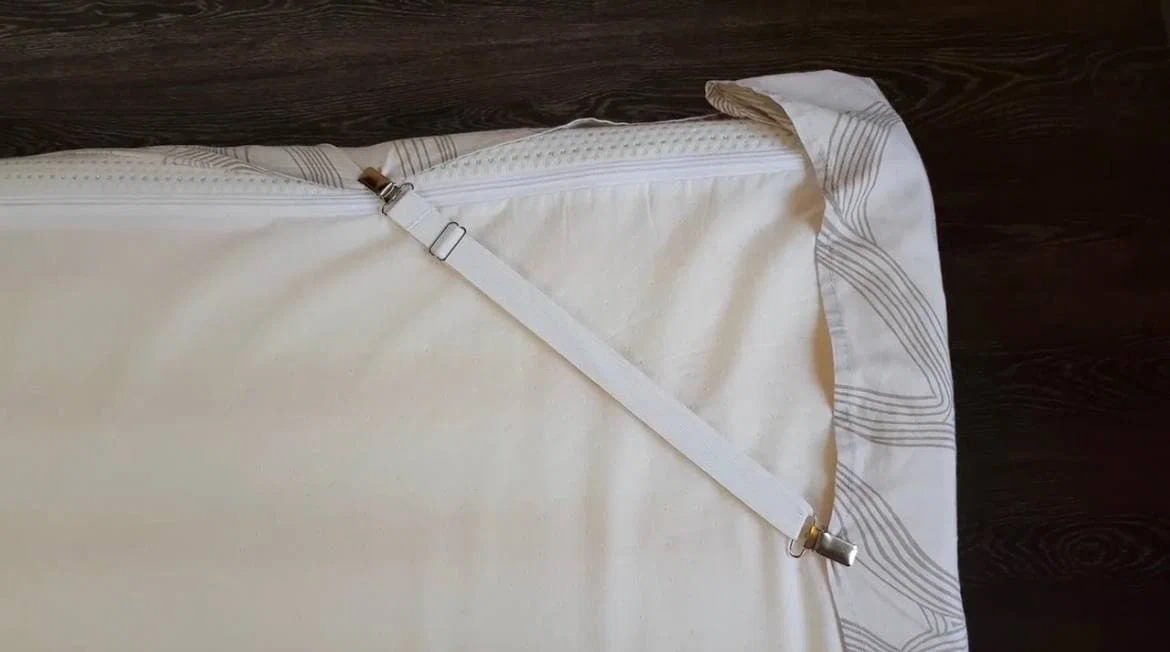 У меня, например, много обычных простыней. И я научилась их надёжно фиксировать, чтобы ничего не сползало. Для этого я использую специальные держатели. Они состоят из резинки и зажимов с закруглёнными зубчиками. Это очень удобно, при использовании таких зажимов ткань не повреждается.