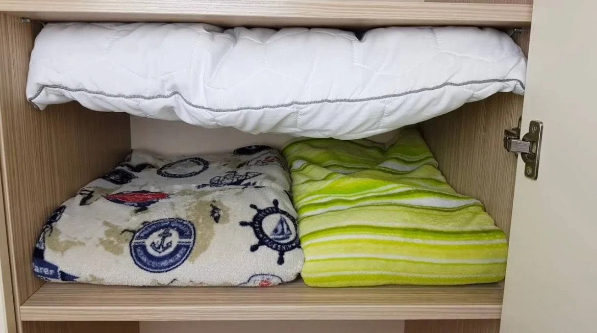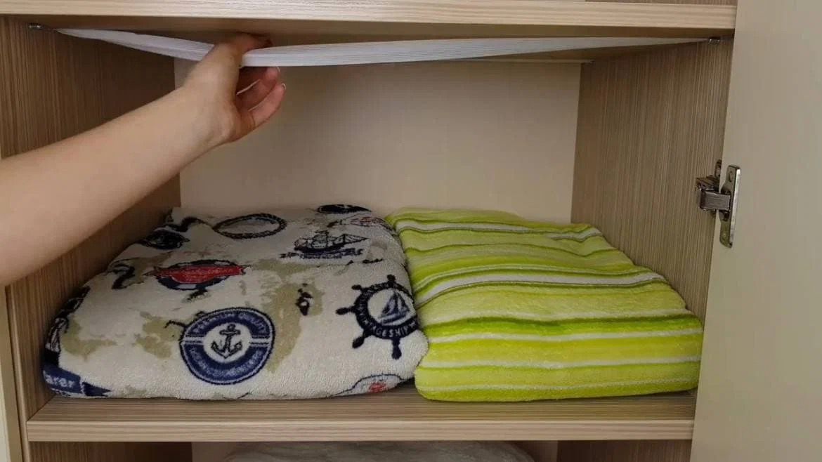 Причём это касается не только шкафов с полотенцами или постельным бельём. Точно также с помощью резинок я закрепляю предметы в кухонном шкафу или ящике с бытовыми предметами.