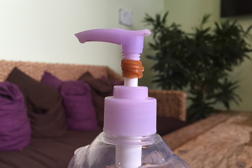 Если дети любят баловаться с жидким мылом, то на диспенсер повязываем резинку.