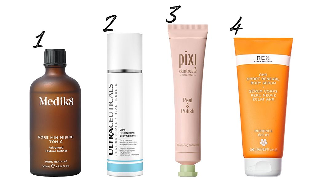 1 — тоник с молочной кислотой Medik8, 2 — ультра выравнивающий лосьон для тела Ultra Retexturising Body Complex, Ultraceuticals, 3 — пилинг с молочной кислотой PIXI, 4 — обновляющая сыворотка для тела с молочной кислотой REN Skincare