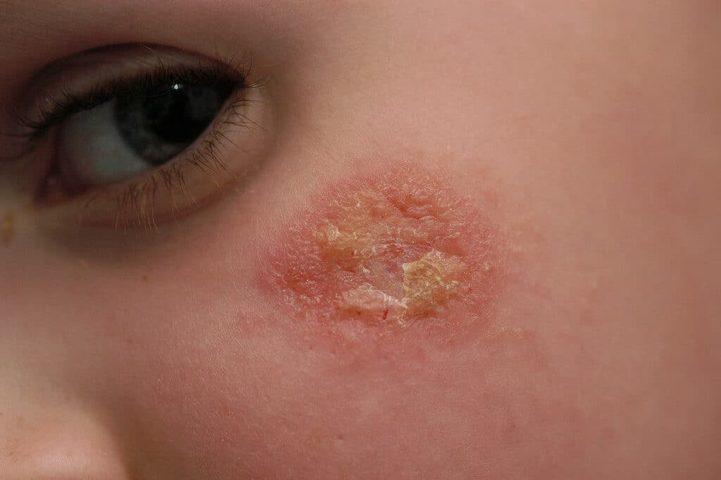 Детям старше двух лет часто сталкиваются с трихофитией и микроспорией. Заражение происходит из-за контакта с уличными животными. Симптоматические проявления такого грибка на лице у ребенка полностью повторяет симптомы стригущего лишая у взрослых. Лечение включает стандартную схему терапии грибкового заболевания. Выбор препаратов осуществляется врачом, так как детская кожа очень чувствительна и агрессивные противогрибковые средства могут привести к раздражению.