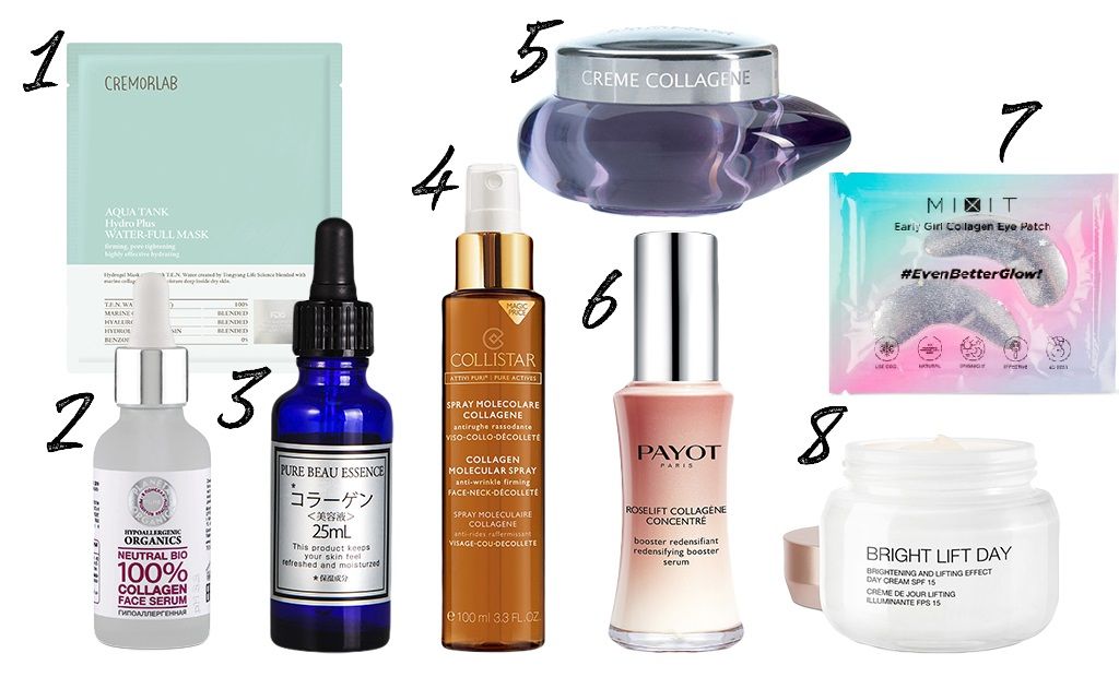 1 — интенсивно увлажняющие маски для лица с морским коллагеном Cremolab, 2 — коллагеновая сыворотка для лица c растительным коллагеном из пшентицы Planeta Organica Pure, 3 — сыворотка для лица с коллагеном Japan Gals, 4 — молекулярный спрей с коллагеном против морщин Collistar, 5 — коллагеновый крем для лица Thalgo, 6 — сыворотка для лица восстанавливающая упругость кожи Payot, 7 — гидрогелевые патчи для кожи вокруг глаз с коллагеном Mixit, 8 — oсветляющий дневной лифтинг крем с морским коллагеном и SPF 15 Kiko Milano