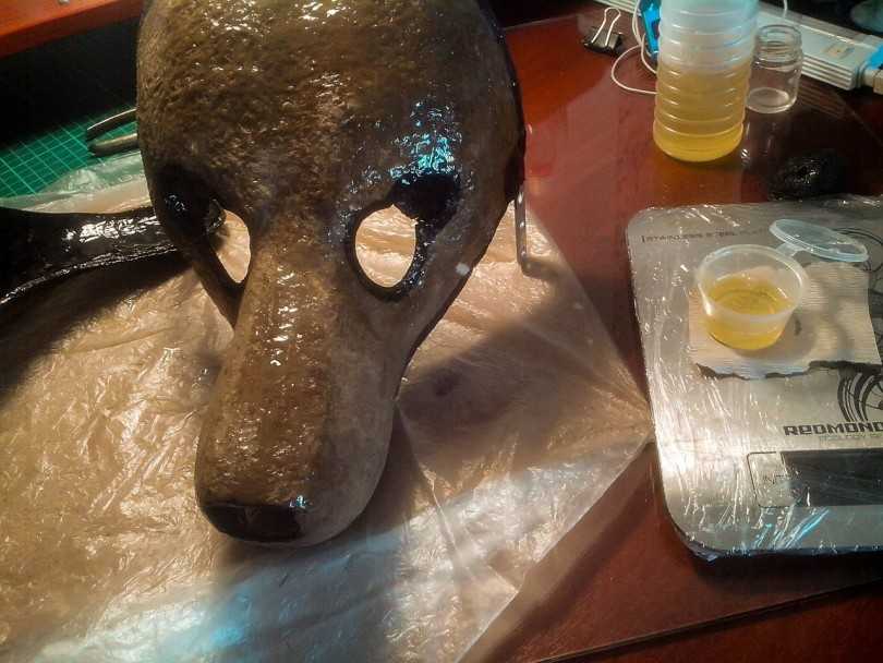 - Обмакиваем бумагу в клеящий раствор и слоями приклеиваем основу маски. Чтобы маска была более прочной, армированной, необходимо нанести 7-8 слоев. Дать маске хорошо просохнуть, покрыть гуашью или другим лаком, украсить и сделать из резинки галстук, сплести. Этот способ, пожалуй, самый простой. Но если вы хотите создать более ценный шедевр, то шаблон маски следует делать не из бумаги или картона, а из: пленки, пенопласта, лепить из пластилина или креативной глины. Именно из этих материалов атрибут будет казаться объемнее, уникальнее, эффектнее. Также мелкие детали можно украсить пластилином, бусинками, перьями.