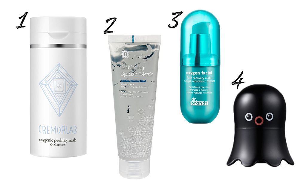 1 — oчищающая кислородная маска для лица Cremolab, 2 — oчищающая пузырьковая глиняная сплэш-маска для лица Blithe, 3 — кислородная маска-флэш для лица dr.brandt, 4 — пузырьковая маска для очищения пор Tony Moly