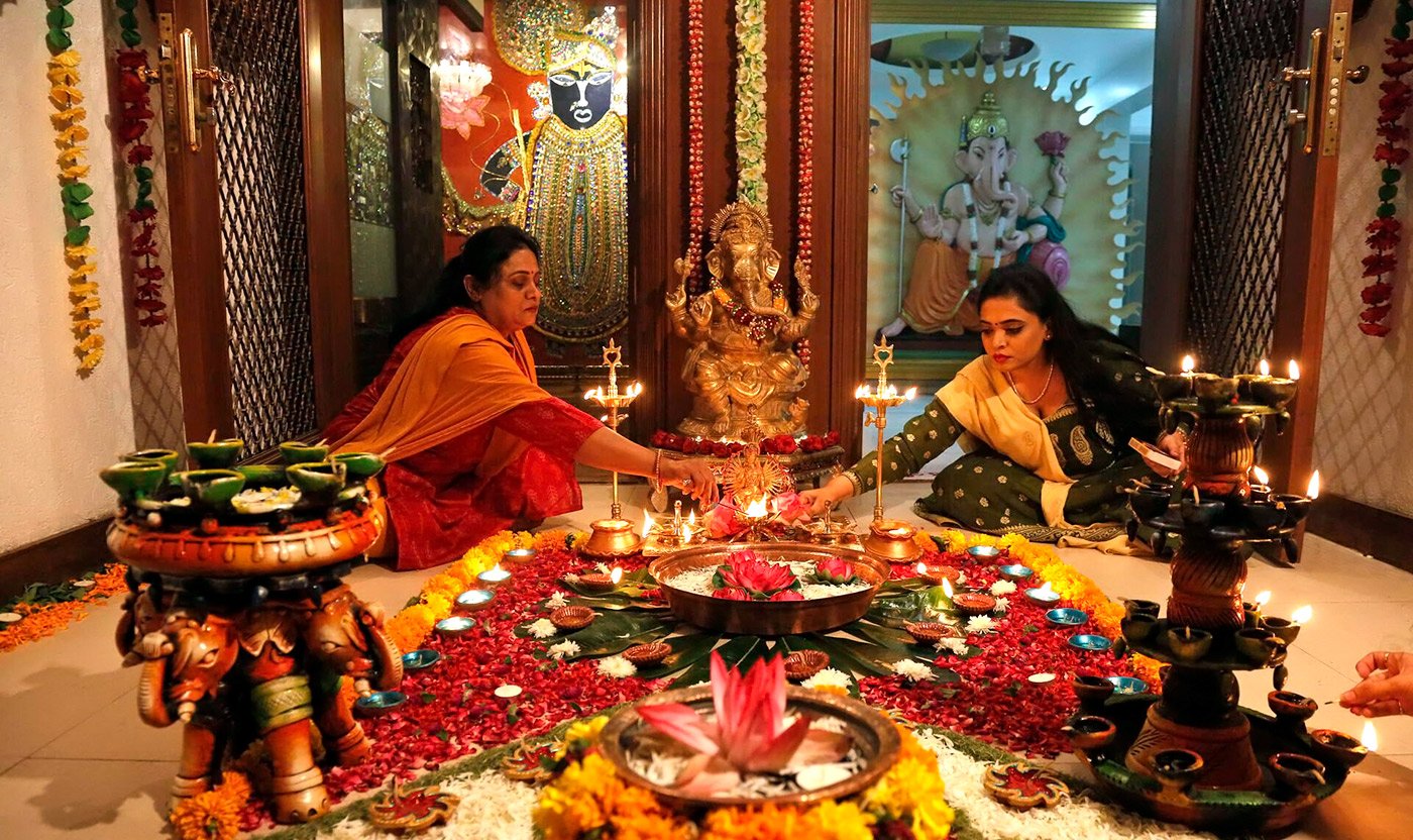 Перед пуджей дома нужно провести тщательную уборку, все помыть. Заранее готовят специальный помост – расстилают красную ткань, в центре которой насыпают горсть риса. Место украшают цветами, помещают рядом статуэтку Лакшми и несколько монет. Рядом рекомендуется положить предметы, ассоциирующиеся с благосостоянием. После того, как все приготовления закончены, начинают читать мантры или медитировать.