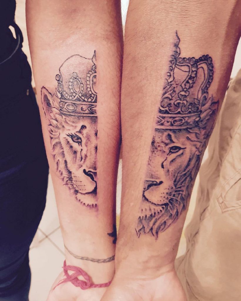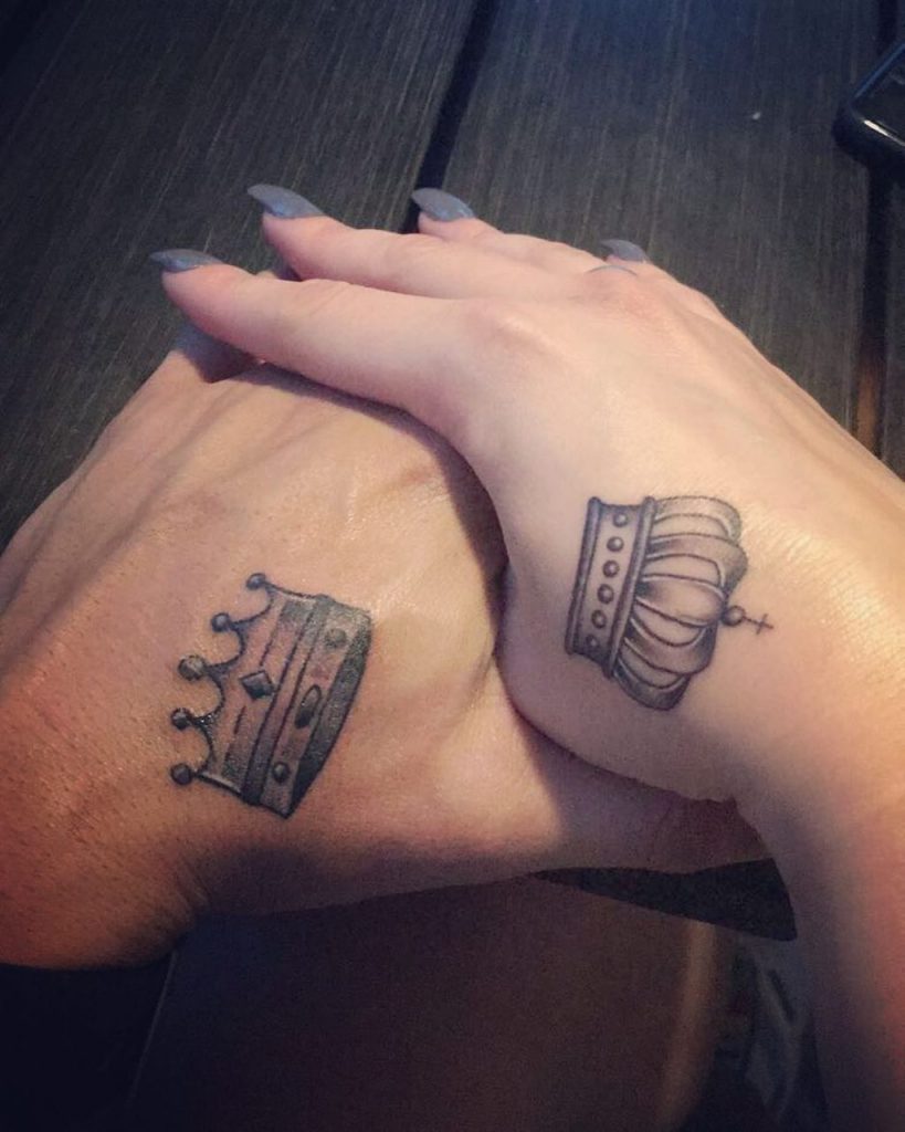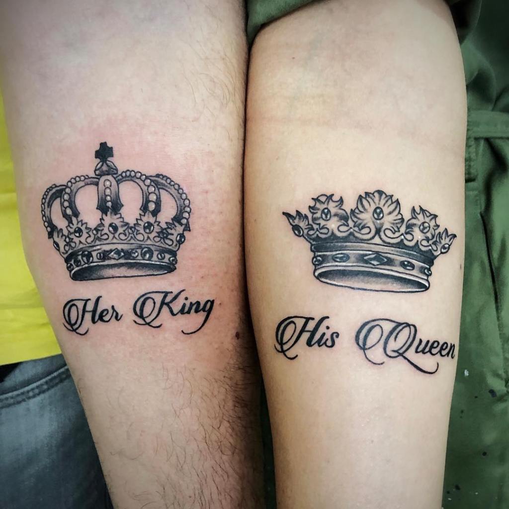 - Парные тату со схожим смыслом для двоих: Корона короля и королевы, замок и ключ, компас и якорь;
