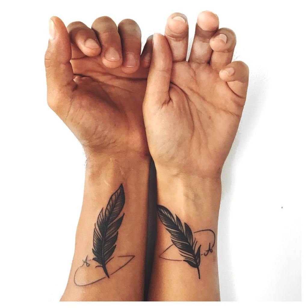 Татуировки в виде маленьких перьев укажут на легкость и утонченность чувств, соединяющих пару.