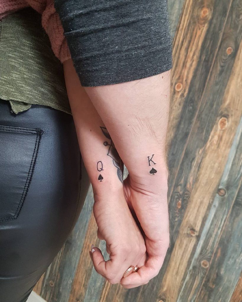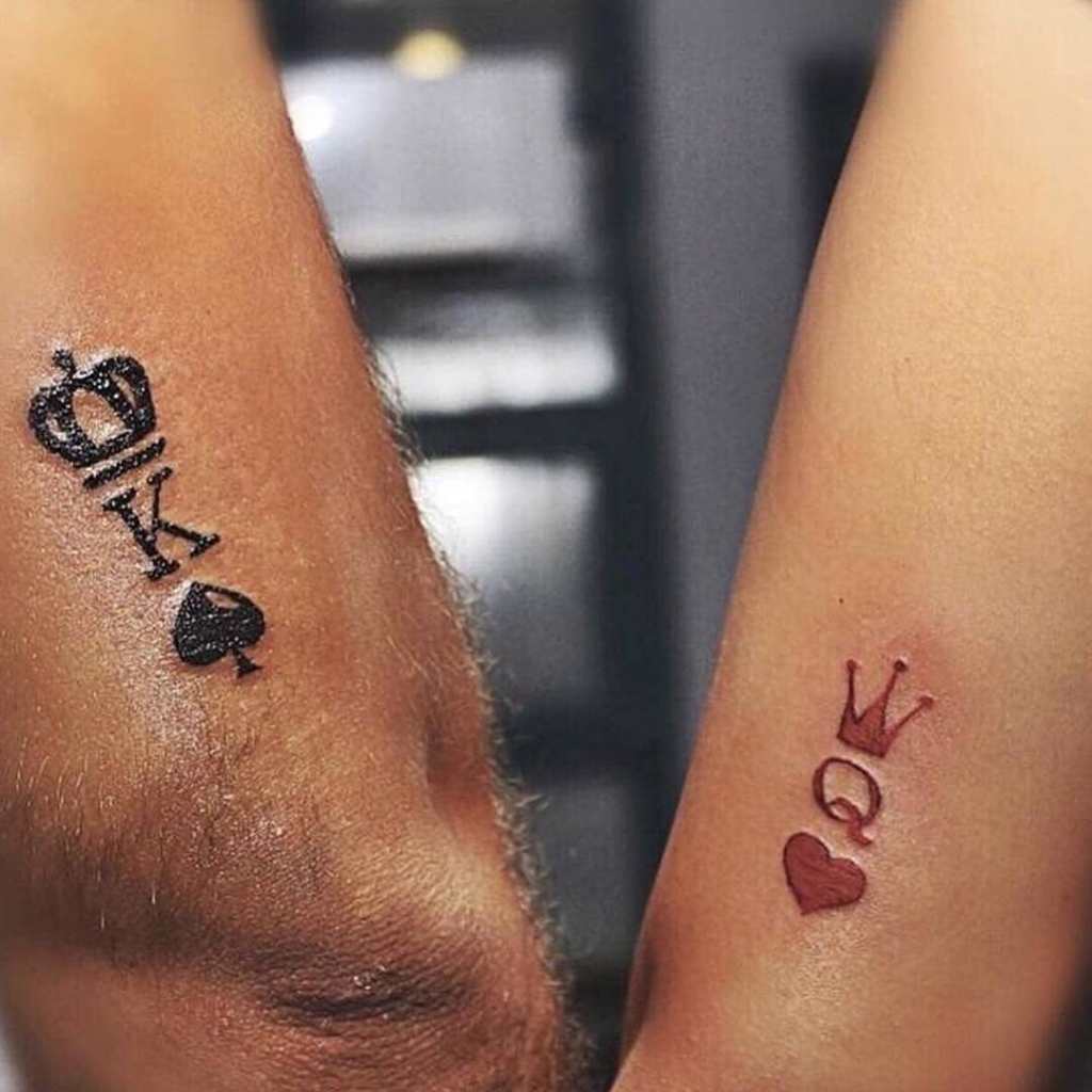 Самым распространенным видом подобной татуировки является рисунок в виде частей паззла. Таким образом, влюбленные будто дополняют друг друга. Редко изображают части лабиринта, где выход ведет ко второй половинке. Тату в виде обручальных колец. На самом деле не обязательно наносить кольцо. Пары выбирают какое-нибудь значимое слово, даже имя. Татуировку делают на безымянный палец каждого. Замок и ключ – самая настоящая классика парной тату. Бесчисленное количество вариаций данной татуировки и бешеная популярность, с глубоким смыслом: ключ от сердца человека находится в одних руках. Карточные персонажи: король и дама, валет и дама. Существуют такие смельчаки, которые могут сделать полное изображение карты с лицом своего сердечного друга или подруги. Идея весьма оригинальная, но уже не редкая. Да и использовать «фото» возлюбленного на теле немного странно. Морская тематика. Примечательно, но многие пары выбирают парную татуировку в виде компаса и якоря. Чаще, конечно, изображается просто якорь. Смысл подобной татуировки в том, что люди наконец нашли и обрели друг друга. Перья. Довольно редкое тату для пар, так как не многие парни могут согласиться на нательный рисунок в виде пера. Означает легкость и возвышенность чувств друг к другу. Небесные светила. Звезды, солнце, луна, планеты – все самое космическое, что можно связать с любимым человеком, ведь он означает весь мир и даже целую Вселенную. Короны. Одна для короля, другая для королевы, соответственно. Недостатком или же негативным значением данной тату можно назвать значение самой короны – это власть. Для влюбленной пары может иметь значение, что влюбленные полностью находятся во власти друг друга.