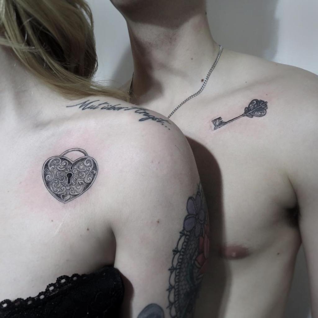 Лучшим вариантом будет вместе со своей любимой проработать все возможные эскизы, отобрав наиболее подходящие по смыслу и значению парные тату с картинками, а потом уже отправляться в салон к опытному мастеру, который внесет небольшие коррективы по фото тату или его эскизу для придания четкости и структурированности.