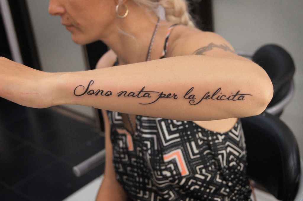 Надпись тату на руке «Sono nata per la felicita»- я родилать для счастья