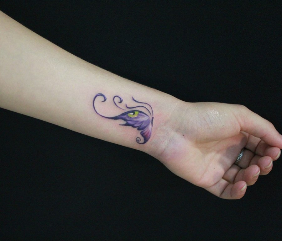 Цветная бабочка – символ трепетных романтических чувств. Мастера, работающие в этом деле, могут сразу сказать причину, по которой девушка выбрала данный рисунок. Желание набить бабочку возможно с возникновением кардинальных жизненных изменений. Появление долгожданного малыша, замужество, изменение в рабочей атмосфере.