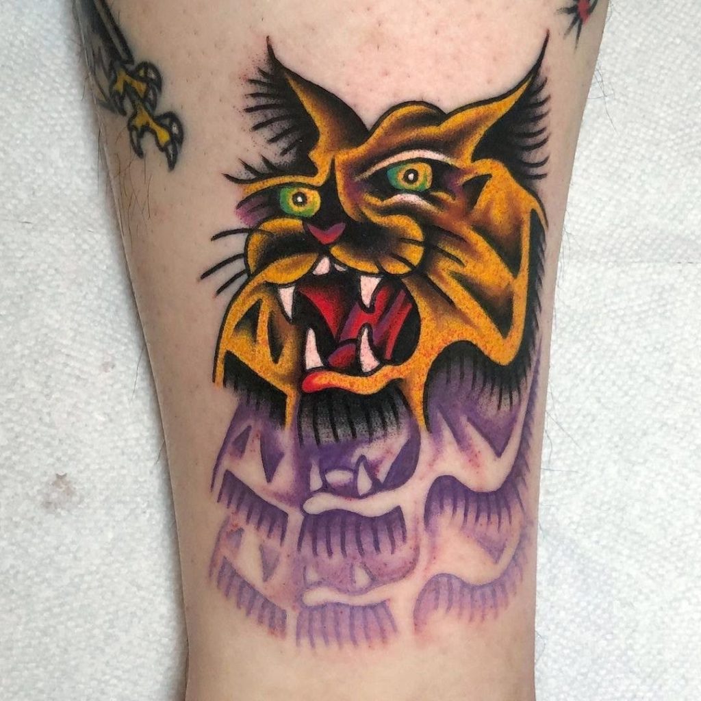 - Олдскул – стиль подразумевает выражение рисунка в определённых тонах, чаще всего это четкие толстые контуры с менее выраженным цветом. Такие тату появились еще в 19 веке и сейчас пользуются популярностью среди девушек и мужчин. Девушки наносят себе не только привычные тату, но и выбирают интересные эскизы в виде бабочек, тигра или цветка.