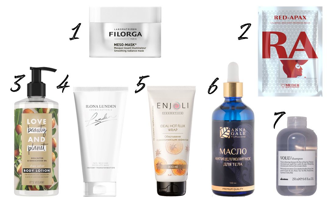 1 – разглаживающая маска, придающая сияние коже, Meso Mask Firorga, 2 – маска Red Apax Meder Beauty Science, 3 – лосьон для тела Love Beauty and Planet, 4 – маска Мгновенное преображение Ilona Lunden, 5 – обертывание с разогревающим эффектом Hot Flux Enjoli, 6 – антицеллюлитное масло для тела Anna Gale, 7 – шампунь Davines