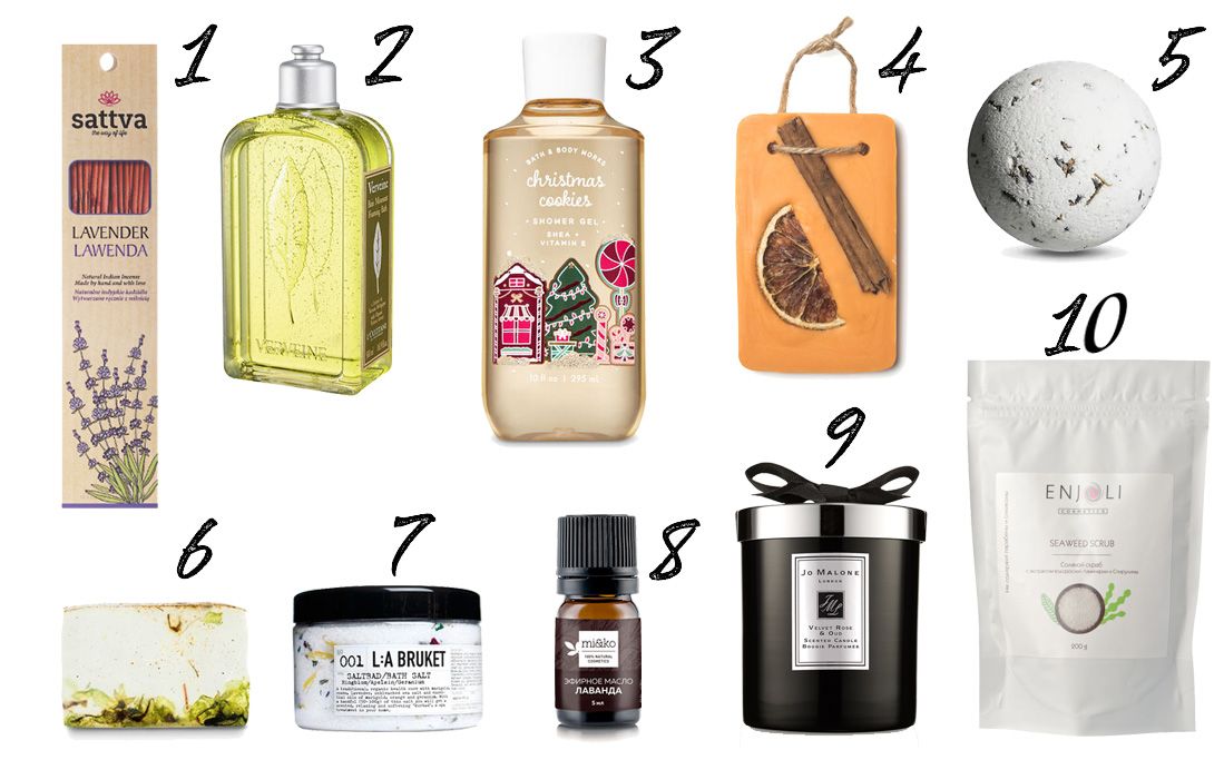 1 – ароматические палочки Sattva, 2 – пена для ванны L’Occitane, 3 –гГель для душа Bath & Body Works, 4 – твердое масло для ванны Lush, 5 – бомба для ванны Windsor’s Soap, 6 – мыло Windsor’s Soap, 7 – соль для ванны La Bruket, 8 – эфирное масло Mi & Co, 9 – ароматическая свеча Jo Malone, 10 – соляной скраб с экстрактом водорослей ламинарии и спирулины Enjoli