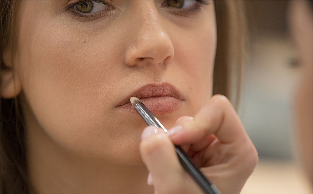 Используем два карандаша. Контур и уголочки делаем более темным, центр — более светлым. Увлажняющая помада придает губам ухоженный вид, не подчеркивает шелушение, создает объем.