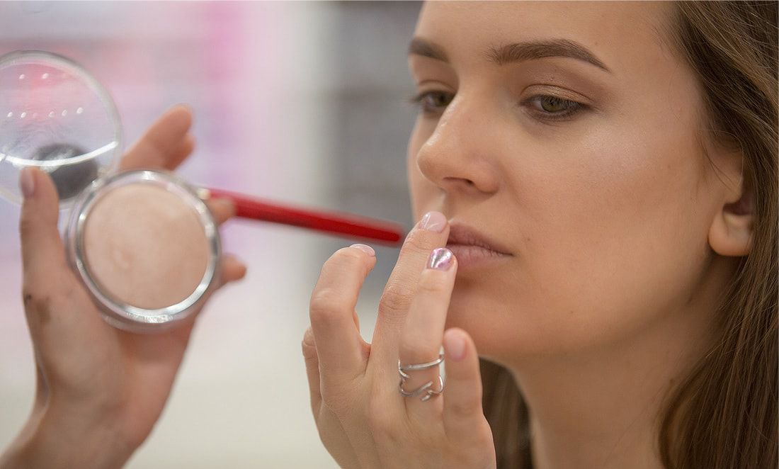 - Наберите на кисть легкую пудру, пройдитесь по лицу.