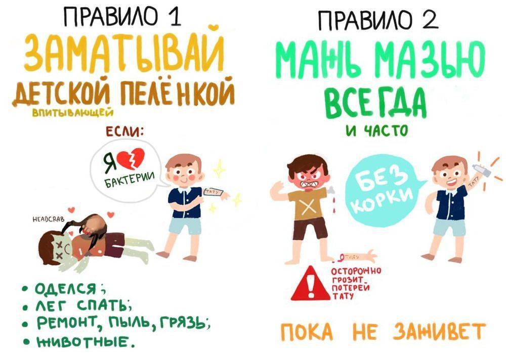 После набивания рисунка необходимо соблюдать простые правила, которые помогут ускорить заживление и предотвратят инфицирование раны. Что делать категорически нельзя: