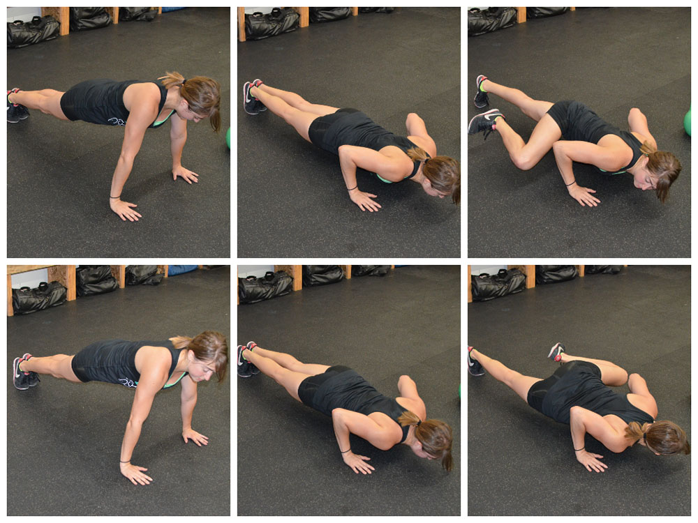 Во-время 1го жима подтягивается к локтям левое колено, во-время 2го жима – правое. И так по-очереди. Упражнение задействует пресс, трицепс, дельтовидные и грудные мышцы. Учит держать равновесие.