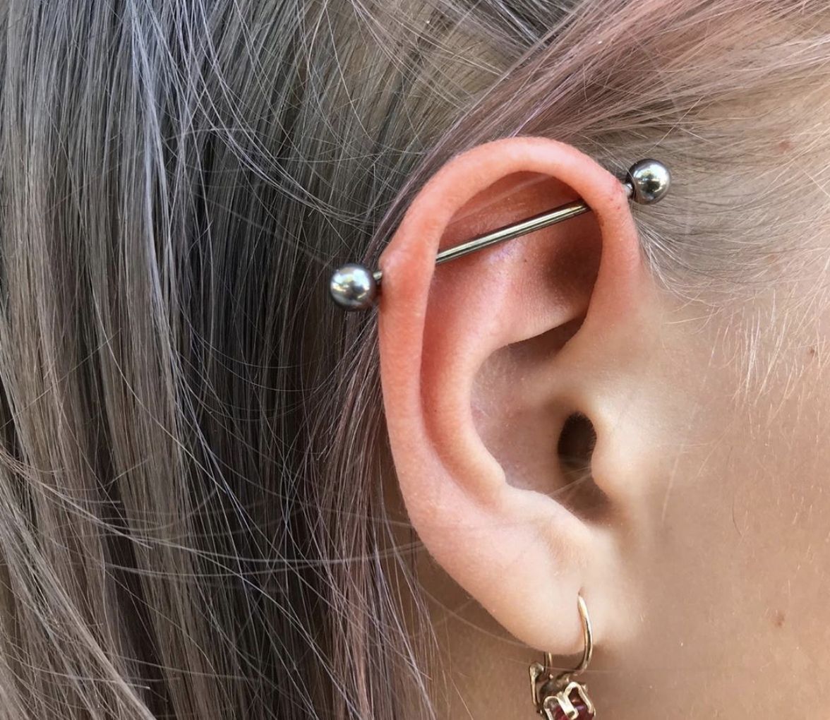 Индастриал также является разновидностью хрящевого прокола, только верхней его части. Делаются две дырки, которые соединяются друг с другом штангой.При классическом индастриале первое отверстие располагается в передней части раковины, около головы, вторая – с противоположной стороны.