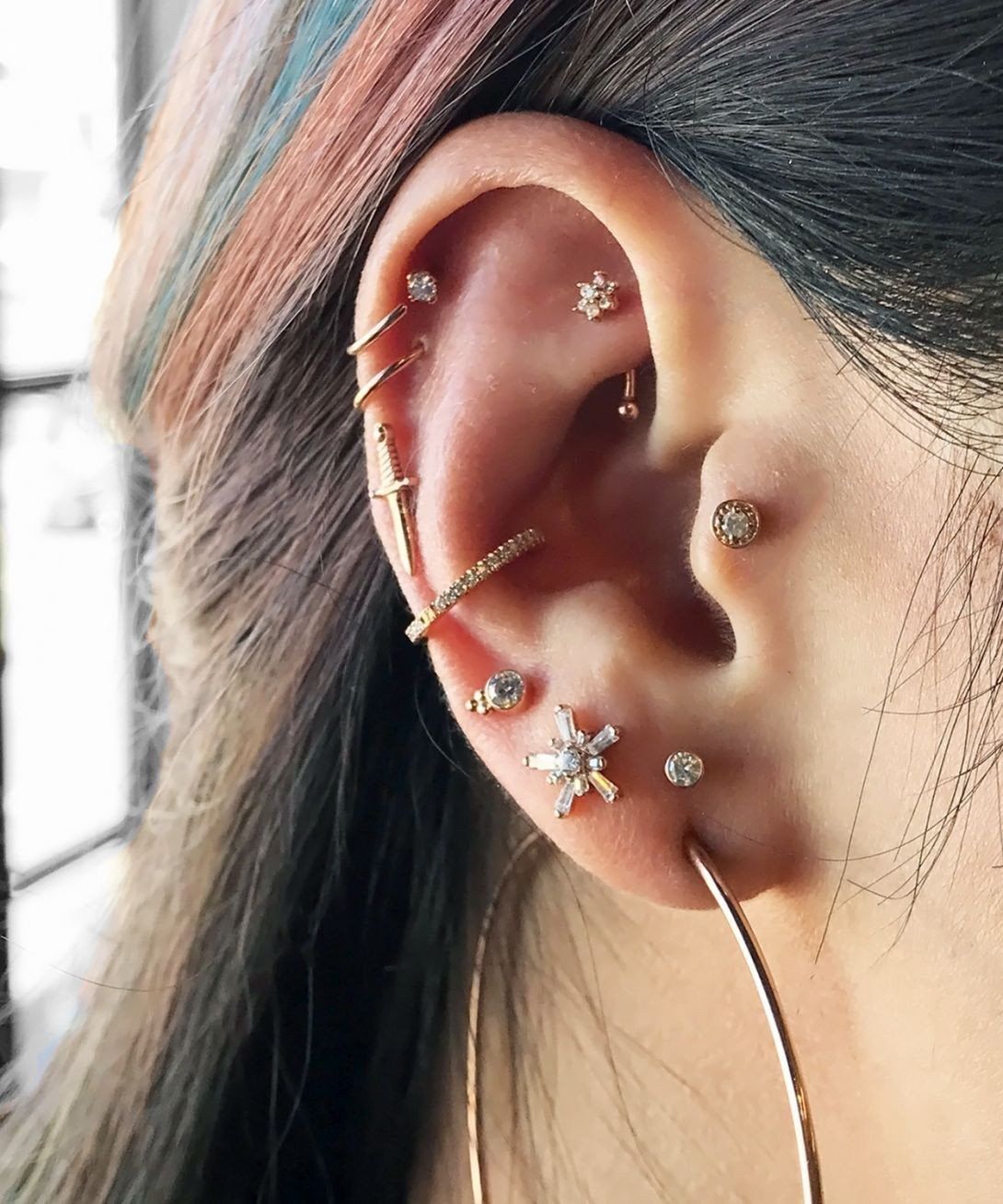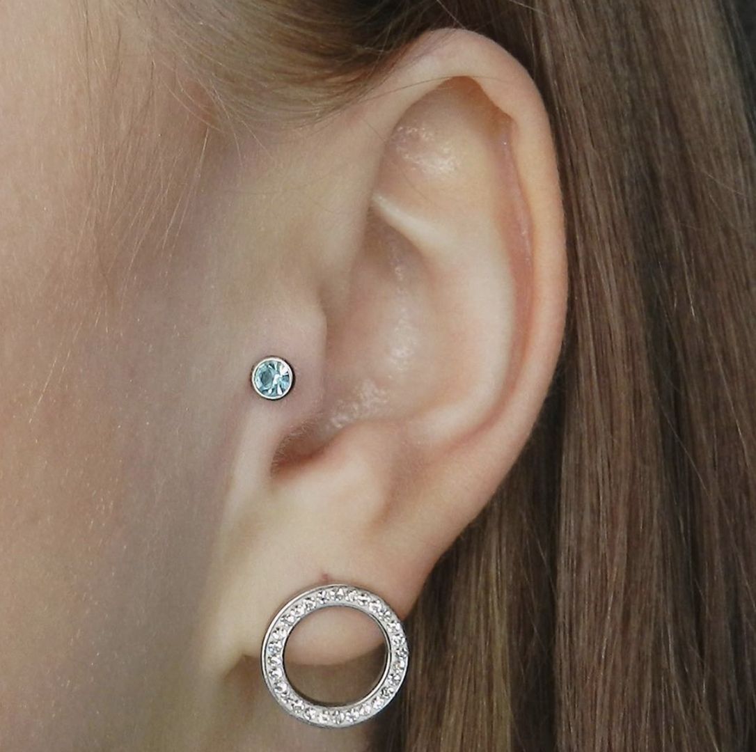 Привлекательный пирсинг с двумя проколами между мочкой и хеликсом. Соединяются серьгой – подковой или твистером.