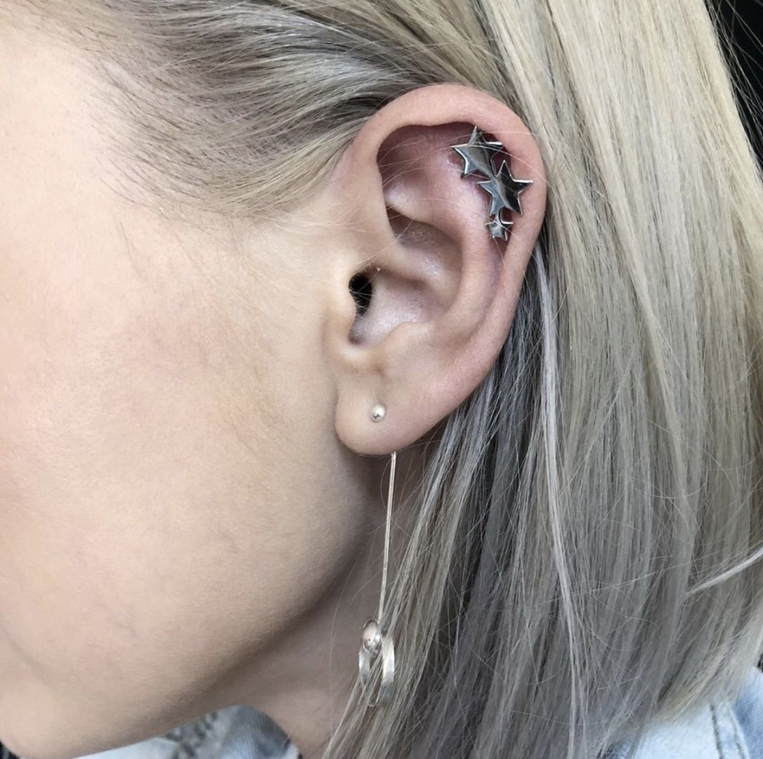 Можно проколоть не только мочку уха, но и хрящик: для этого чаще всего выбирается верхняя часть ушной раковины.