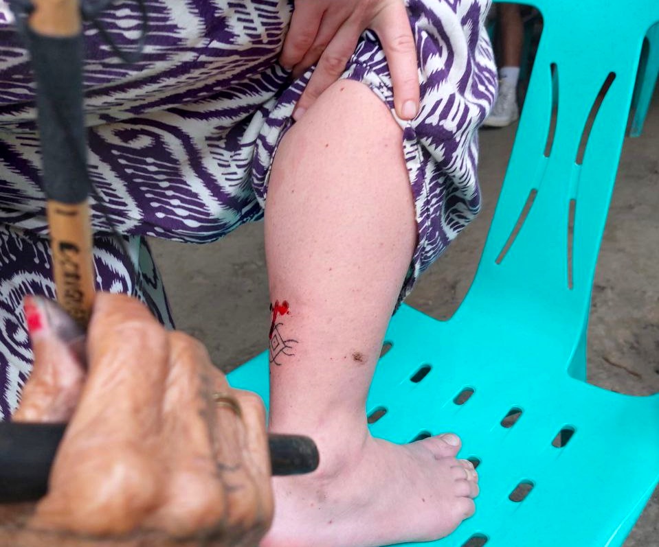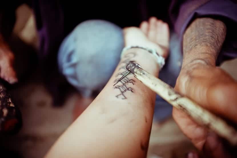 Для татуировки Ванг-од использует традиционный инструмент: палочку из бамбука с иголкой от цитрусового дерева, а в качестве краски — разведённый уголь.