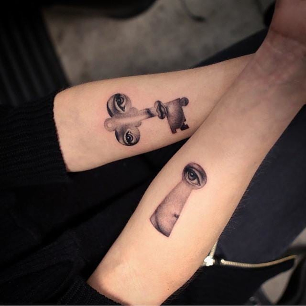 Парное тату можно приравнять к категории символов. Большинство эскизов используются для выражения чувств влюбленных. Чаще всего выбираются символические рисунки с ключом на одной руке и замочной скважиной на другой. Композиция символизирует открытую душу обоих партнеров, доверчивые отношения между ними.