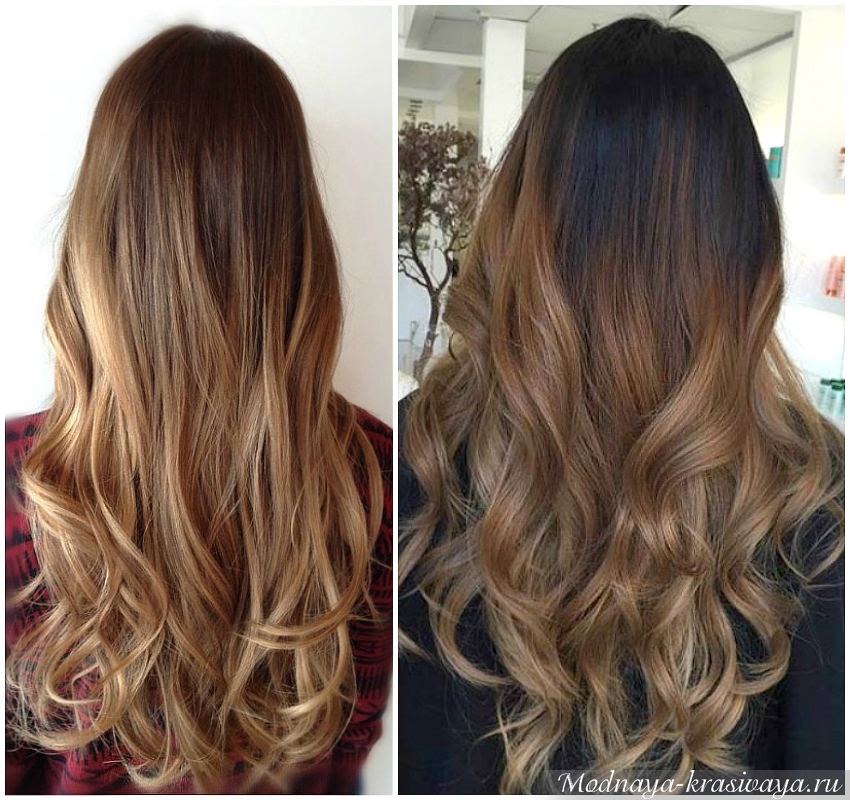 Шатенки, русоволосые и обладательницы рыжих волос смело могут делать переход от природных оттенков в янтарные, карамельные, медовые, кофейные и шоколадные. Можно растягивать цвет в сторону золотистых, красноватых и медных тонов.