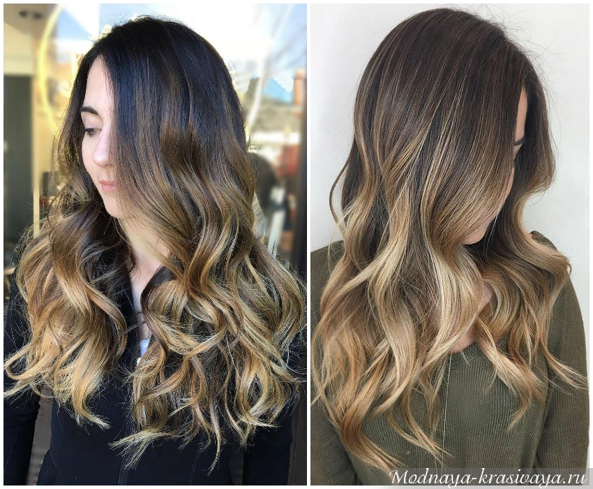 Длинные волосы можно окрашивать в любой технике растяжки, а удлиненные волнистые и кудрявые волосы украсит переход цвета в технике балаяж и шатуш с бликами.
