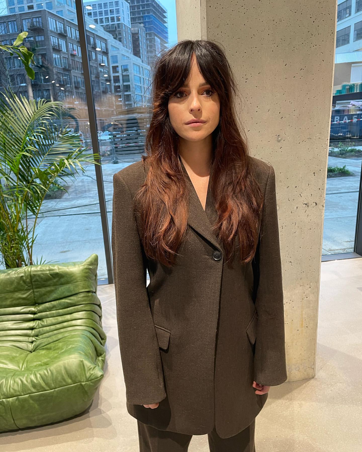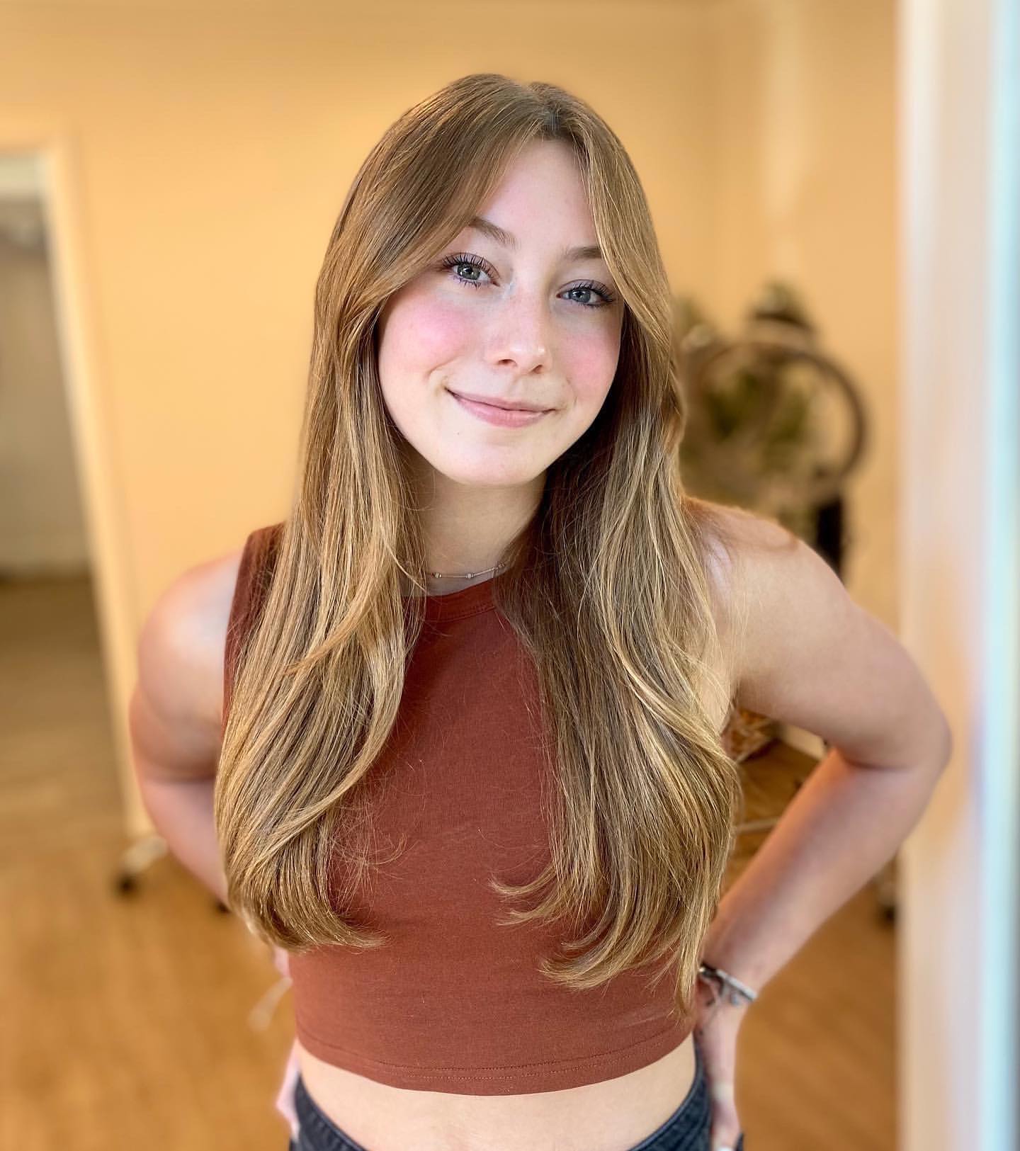 Для прямоугольного лица подходят челки, которые делают лицо более круглым и смягчают черты. Челка шторка с облегающей формой и боковым пробором, при этом заканчивающаяся на линии бровей, поможет сделать лицо более пропорциональным.