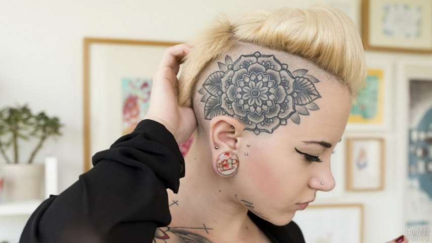 Для придания стрижке большей креативности некоторые предпочитают заполнять выбритые зоны татуировками, всевозможными узорами или просто окрашивают их в яркие контрастные цвета.