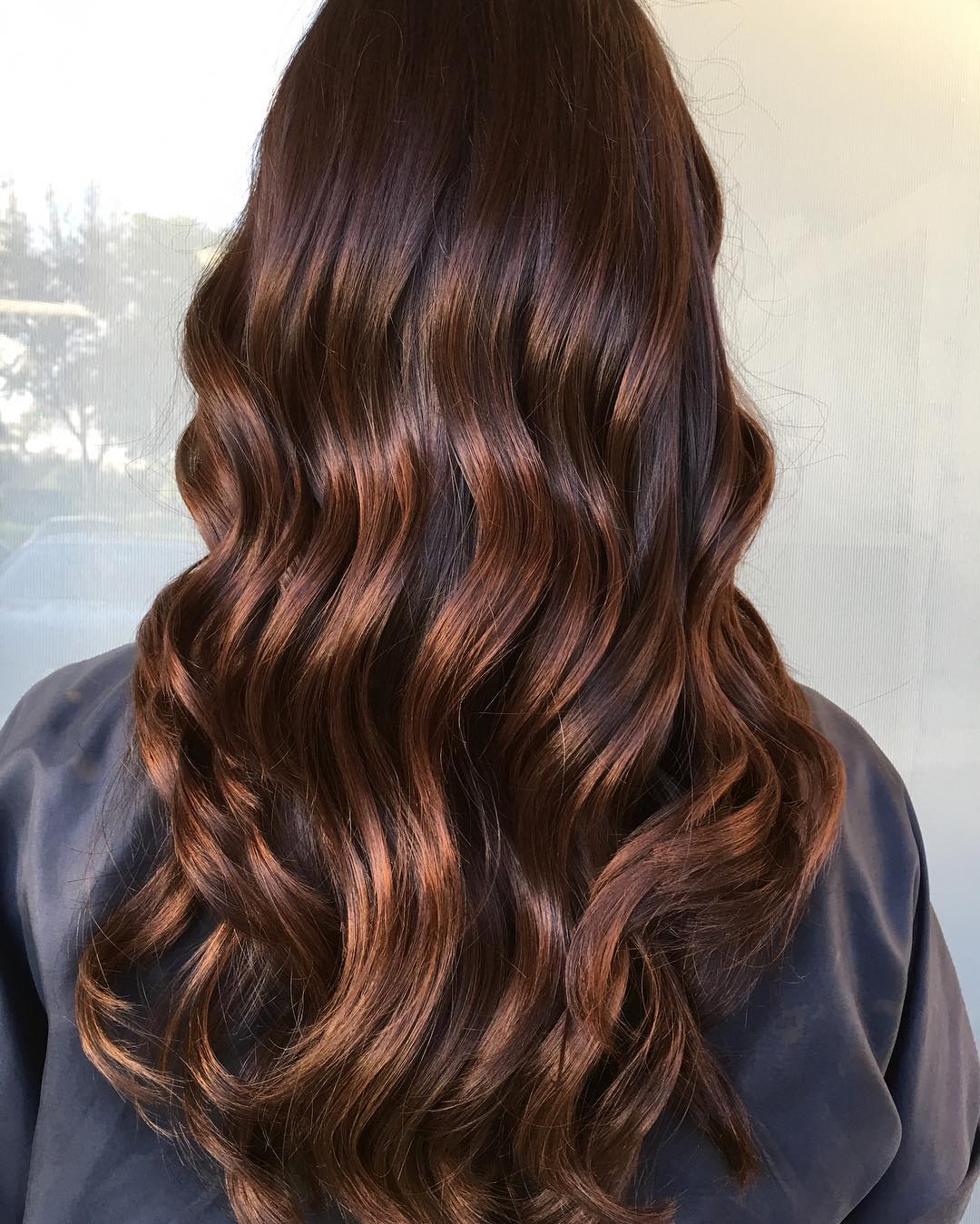 При правильном окрашивании волос шоколадные локоны будут отдавать благородным оттенком красного лишь в ярких лучах солнца. Это станет для любого лука модным акцентом.