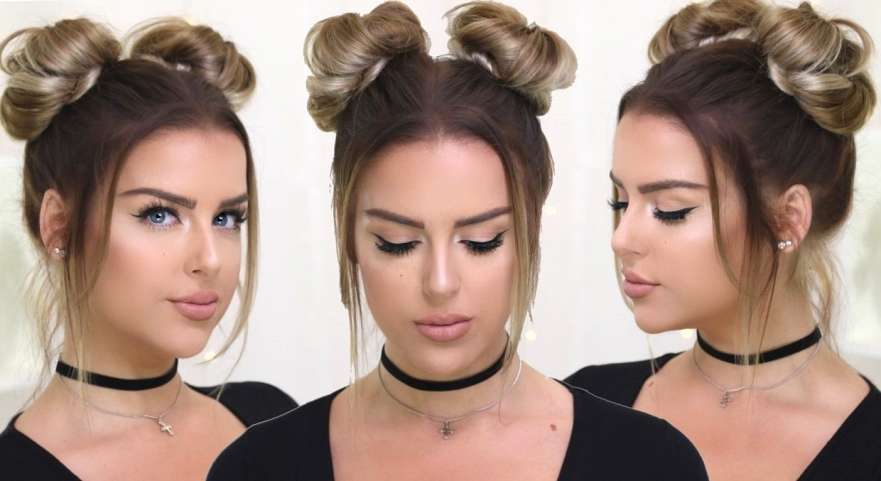 Разделите волосы на две равные части при помощи тонкого кончика расчески, затем завяжите два высоких хвоста. Далее распушите волосы и обмотайте у основания кончиками хвоста. Закрепите «бублики» у основания шпильками и слегка расслабьте прическу, немного выпустив пряди.