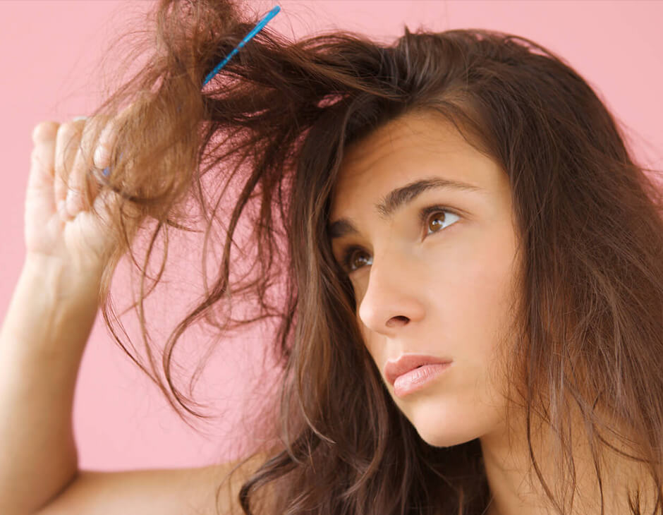 Кончики волос начинают сечься из-за пересушенности. Структура волоса нарушается, он становится более хрупким, ломается и раздваивается на конце.