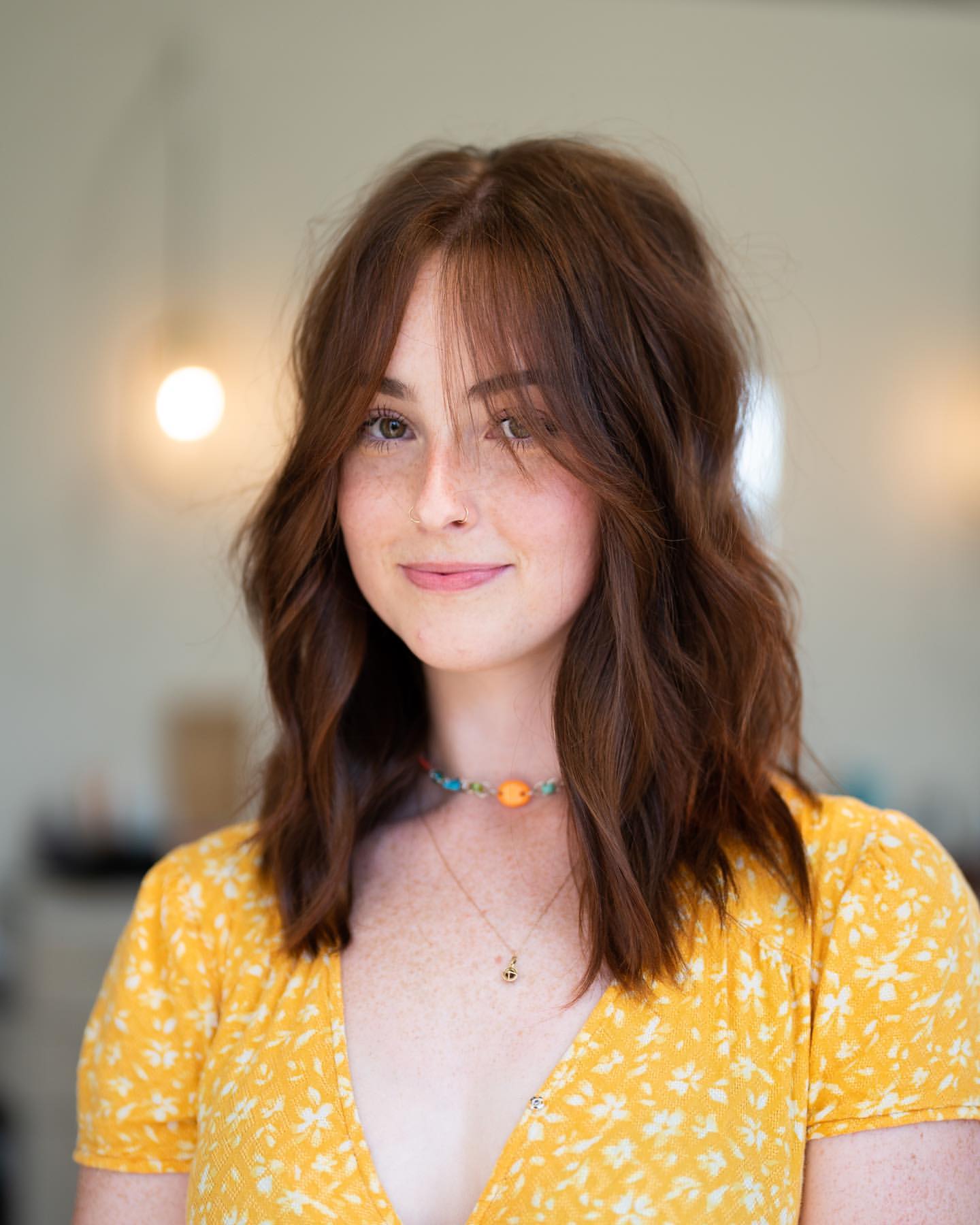 Каскад с отросшей челкой. Такая прическа подойдет практически всем, а смотрится она очень непринужденно и естественно. Челку можно укладывать разными способами, меняя пробор.