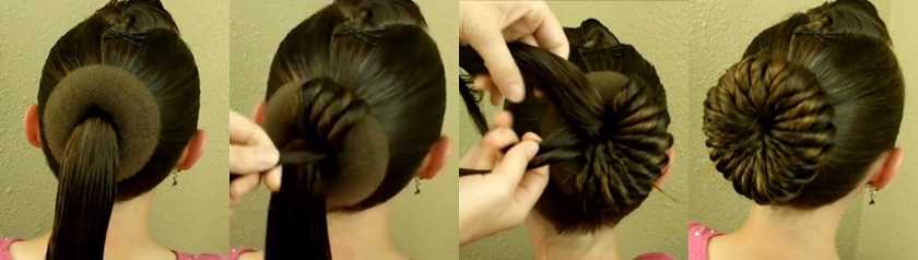 Помимо всех описанных выше укладок, существуют ещё и другие. Например, прическа шишка с косами, для её исполнения также нужен валик для волос. Пошаговая инструкция: сначала делаем высокий пучок до момента когда одели валик. Дальше заплетаем штук десять тоненьких кос на равном расстоянии друг от друга по кругу, и закрепляем все это тонкой резинкой.Остатки локонов прячем с помощью шпилек.
