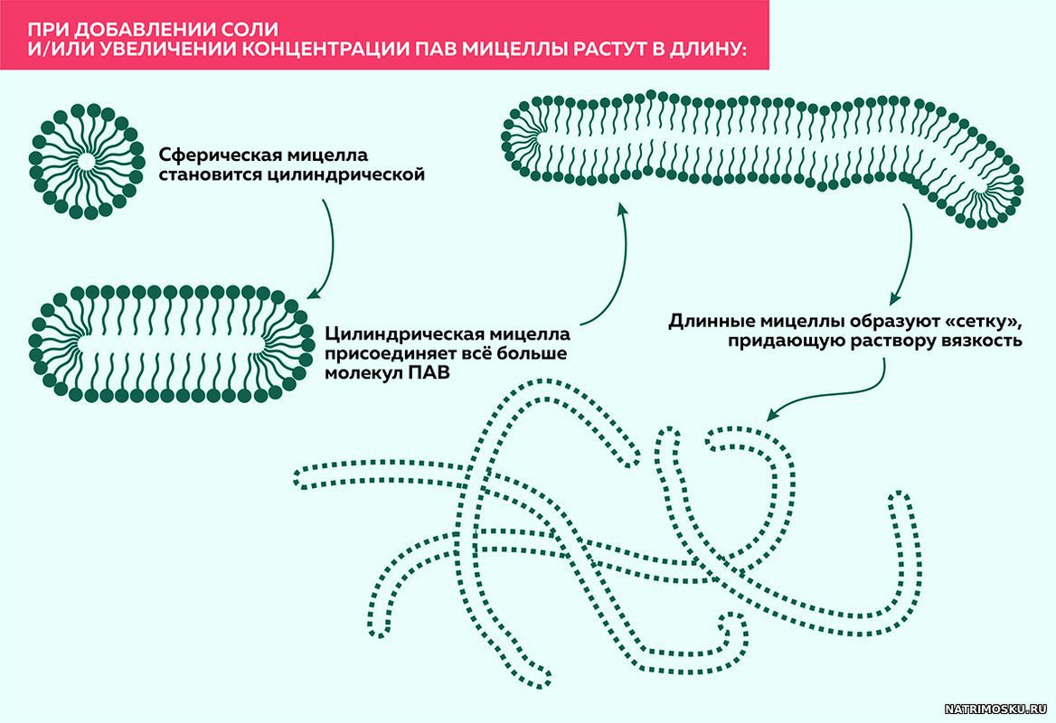 Что происходит, когда мы используем несколько видов ПАВ? Мицелла становится смешанной, более крупной и менее агрессивной по отношению к коже и волосам. Причём у каждого ПАВ есть такая штука как критическая концентрация мицеллообразования (ККМ): когда молекулы ПАВ перестают просто плавать в растворе и начинают собираться в мицеллы. Если концентрация ПАВ продолжает расти, мицеллы вырастают в мицеллищи, сперва становясь цилиндрическими, а затем превращаясь в длинные червеобразные мицеллы, которые могут «прорастать», образуя разветвлённую сетку. Длинные мицеллы, как волокна в комке ваты, переплетаются между собой и придают раствору, который мы называем шампунем, вязкоупругие свойства — шампунь густеет.