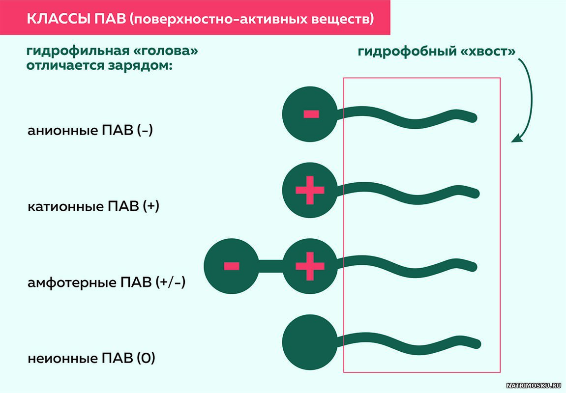ПАВ делятся на 4 типа: анионные, катионные, неионогенные и амфотерные. Все молекулы поверхностно-активных веществ длииииинные, вся их длина – это гидрофобный хвост, а отличаются они короткой частью, гидрофильной: