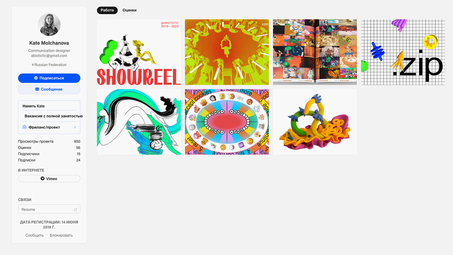 Так выглядит профиль графического дизайнера на Behance для посетителя. Кейсы расположены по дате добавленияСкриншот: Behance / Skillbox Media